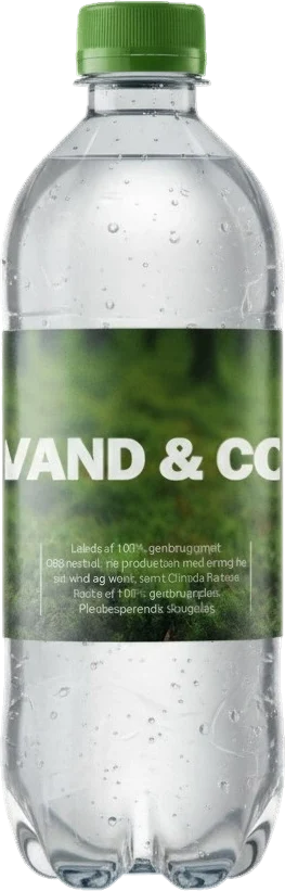 Hele sortimentet af vandflasker, hvis det ikke er vores glasflasker, produceres nu i genanvendt plast, hvilket betyder at vi ikke sætter ny plastik ud i naturen, men derimod genanvender den plastik som bliver indsamlet.